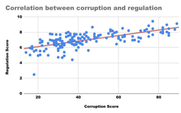 While, of course, correlation does not necessarily equal causation, and I have yet to perform research to determine causation, theoretical deduction – or a priori reasoning – does offer an explanation for why regulation could be the cause of corruption.