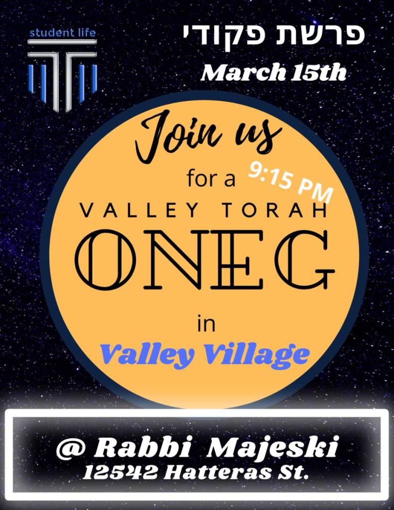 Every year, Valley Torah has many different astonishing Onegs ranging from the Valley, the City, and even Tarzana. Wherever it is, friends sleep at each other’s homes to attend these special events as they know these experiences are everlasting. As the students were walking through the hallways recently, they noticed that there were posters. When they read the poster, they were ecstatic when they saw that it stated there would be an Oneg at the home of Rabbi Majeski on Friday Night, March 15, in Valley Village. As soon as they got home, they made arrangements to be there for this outstanding weekend looking forward to it every day. Rabbi Majeski’s Oneg is always an event that no one wants to miss! As soon as Friday approached, everyone was euphoric. As Shabbos approached, they all went to their friends’ homes to prepare for Shabbos. Some of the Rebbeim hosted their shiur for Shabbos Dinner and walked to the Oneg as a group. As soon as everyone arrived at the home of Rabbi Mejeski, they sat around the elegant Shabbos table that was set with different candies, snacks, and drinks for their enjoyment. As they settled in, Rabbi Majeski started with a powerful story. As he concluded the story, the room burst with Ruach and Achdus.