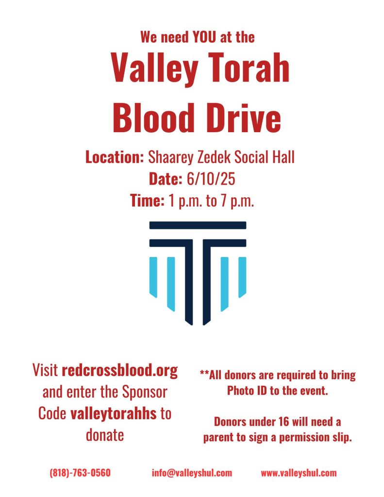On Jun 10th, 2025 from 1-7 pm, Valley Torah hosted a blood drive in the Shaarey Zedek Social Hall. They were able to round up about 15-20 donors. Around 7 workers arrived with vans ready to help in the blood drive, which not only included red blood cells, but also platelet donation.